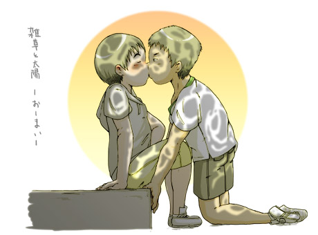 陽はすっかり傾き、校庭がオレンジ色の海になる。 それでもここは、相変わらずの暗がりで、 それでも今は、それがなんだかとても心地良くて。 校庭の隅のアスファルトの段差に、ノリと2人。 他にはもう誰もいない。 目を細め、何処か遠くの方をジーッと見つめている。 きっと、勝利の感傷に浸っているんだろう。 そんなノリの隣りで、僕はただただそれに付き合う。 特に意味はないけれど、今僕が一番したいことがこれだから、 自分の気持ちに正直に、こうしているだけだ。 …と、 見つめる横顔が急に僕の方を向き、直に視線が合う。 心臓が1つ大きく跳ね、連鎖のようにすぐさま視線を地面に落とす。 …と、 「なんだ、ユキ、いたのか。」 え、…ちょ、 「そ、それはないでしょ。」 さすがにちょっとムカついて、叱るようにそう言う。 「そーか。」 何がそうなのか良く分からないけど、 「うん。」 とりあえずそう、返事をしておいた。 マイペースと言うか、単にノリらしいと言うか、 でもまぁ、これがノリだよね。何故だか、にやけてしまう。 胸のムカムカも、どうやら気のせいだったみたい。 「そーだ。」 「ん?」 今度は、何? 「ユキには、いろいろしてもらったからな。」 「え?…、う、うん…。」 まぁ、僕が好きでしてただけなんだけど、 むしろ付きまとい過ぎて邪魔に思われてないか心配だったくらいだけど、 「まぁ、その、あの、」 「…ん。」 …ん?歯切れ悪く続けようとするノリ。 も、それが出来なかったのか、その代わりとしてか、 適当な木の枝を拾い、それを豪快に地面に走らせる。 大きく不揃いな文字が、僕の目の前に描かれる。 「ん。」 これだ、とばかりに、その下にアンダーラインを付け加える。 『ありがとう』 直接口で言えばいいのに、どんだけ不器用なんだよ。 顔もあっちに向けちゃって、見せてくれない。 でもそれが、どうしようもなく可愛くて、 言葉で伝えられるよりも、きっと何十倍も嬉しくて。 「…はい。」 思わず敬語になったのは、 僕の気持ちがバレてしまいそうで、怖かったからかもしれない。 「…でも、なんだ、その、 なんだかんだで、余裕の勝利だったよな。」 僕に通じたことを確認すると、枝をポイッと得意気に投げ捨てて、 無理矢理話を逸らしたのがバレバレの不自然さで、 いつもの調子に戻るノリ。 なーにが余裕だよ、あんなにいっぱいいっぱいだったじゃないか。 あのノリも、あのノリも、あのノリも、全部初めて見るノリだった。 でも今思えば、どのノリも変わらずにカッコよかったな、なんて、 …駄目だ、思い出したらまた、…あーあ。 まぁ、とりあえず、 「うん。」 過程はどうあれ、結果だけ見れば、本当に余裕の勝利だった。 ノリが思い上がるのも覚悟で、返事ニ文字に同意する。 「だよな。」 あらら、完全に天狗だこれ。 でも、いいと思う。あれだけ頑張ったんだもん。 誰も見てないし、僕相手に好きなだけいい気になればいいよ。 呆れてるんじゃなくて、僕の願望として、ね。…と、 そうだ、1つ気になっていたことが。 ずっと訊かずに記憶の果てに飛ばそうと思っていたけど、 これだけ強気なノリを見てると、訊いちゃえって思っちゃう。 大丈夫、怒らないし怖くないって、約束してくれたし。 ふぅ、収まってきた下半身に力を入れて、…よし。 「そう言えば、あれ、なんだったの?」 「…ん?」 あれじゃ分からねーよ。あれじゃ分からないよね。 「あの、…言いたくなかったらいいんだけどさ。 その、…あの、もし、…負けちゃったら、…ってヤツ。」 体は大丈夫、制御出来ている。 ノリは、 「…あぁ。」 怒ってはいない、けど、いい表情ではない。 そりゃ、そうだよね。 「あれは、…」 少しだけシンキングタイム。 言いたくなかったら、別にいいんだけど、 ちょっとだけ、知りたいかな、その、興味本位と言うか。 口で言いづらかったら、その、土に書いてくれてもいいし、その、 「やってやろうか?」 !? モジモジする僕に、とんでもない提案をするノリ。 そんな奇襲攻撃、ズル過ぎるよ。 過去最高速でハチ切れそうになる、僕のあれ。 前屈みにならざるを得ない僕を、どうか見逃してください。 「どうした?腹でも痛いのか?」 「いや、そうでもない…」 「?」 「な、…なんて?」 「え、だから、やってやろうかって。 鹿島が考えた、負けたときのヤツ。」 「なっ…」 な、ななな、そんなこと言われたら、 僕、どうすれば…、 「まぁ、ユキが嫌なら、別にやらんけど。」 それは、何と言うか、ちょっと、もったいない気も… 「そ、んなことは…、な…、い。」 「ん。…ふむ。」 …ふむ。 「ユキがやって欲しいなら、やってやってもいいけど。」 核心に迫るノリからの、きっと最後の確認。…チャンス。 どうする、どうするの僕。 本能はもちろん、最低だけど、イエスと言ってる。でも、 ここで理性を捨ててしまったら、僕は本当に、 どうにかなってしまうかもしれない。 ノリは、大事な、大好きな、